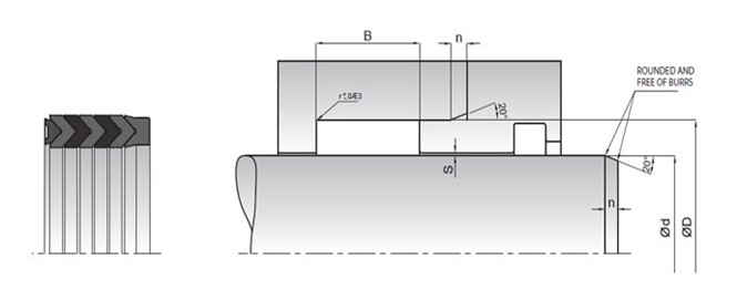 Ensemble d’étanchéité de tige de chevron, conception de lèvre flexible, bague de support. Bonne capacité d’étanchéité à haute pression. La quantité d’anneau en V peut être ajustée, principalement pour les systèmes hydrauliques lourds et hydrauliques.